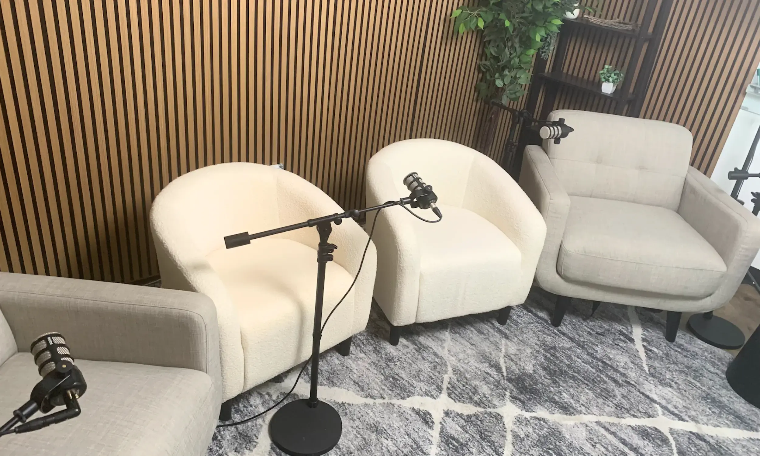 Podcast in comfort - sofa seating, 3 mics, studio lighting
