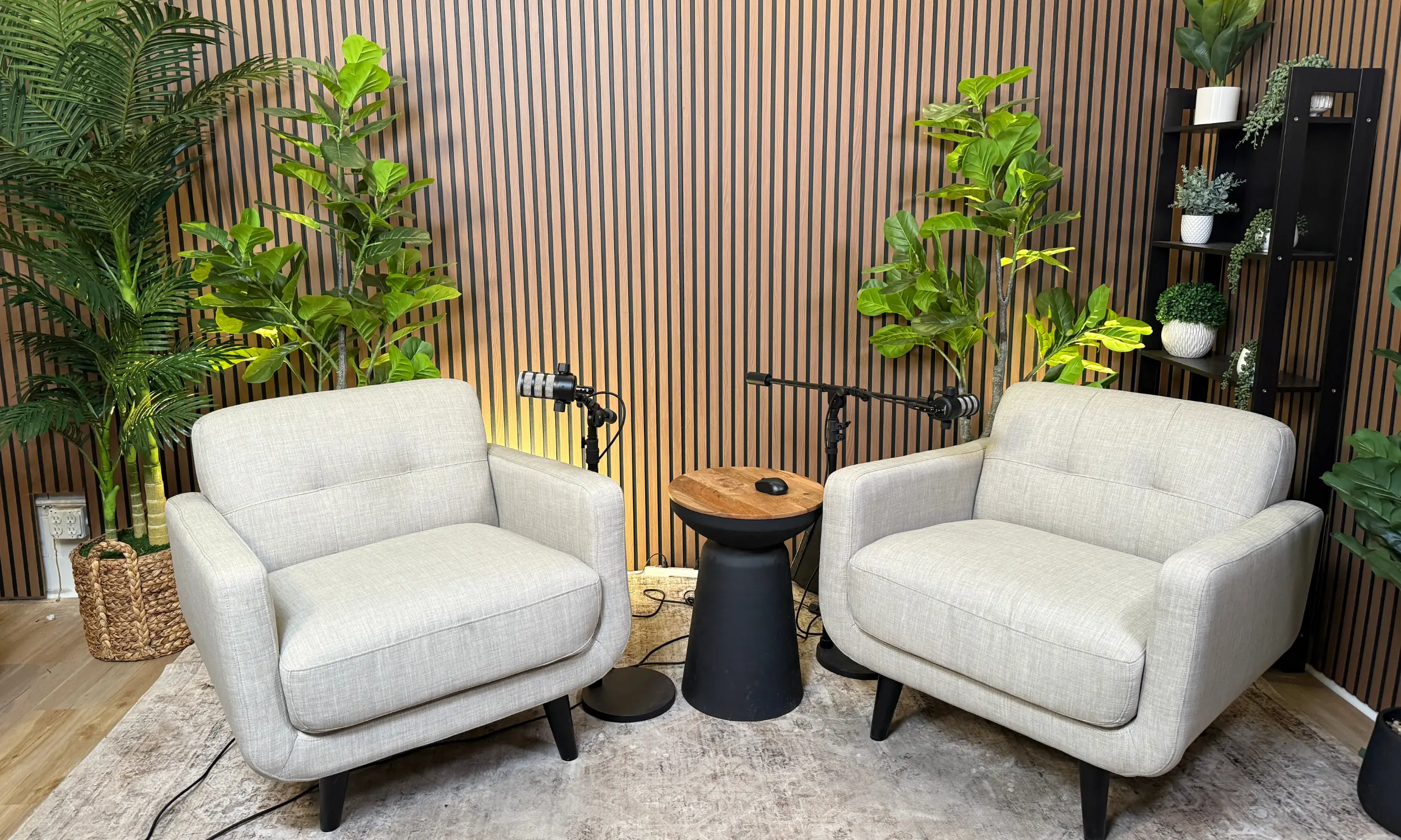Podcast in comfort - sofa seating, 3 mics, studio lighting