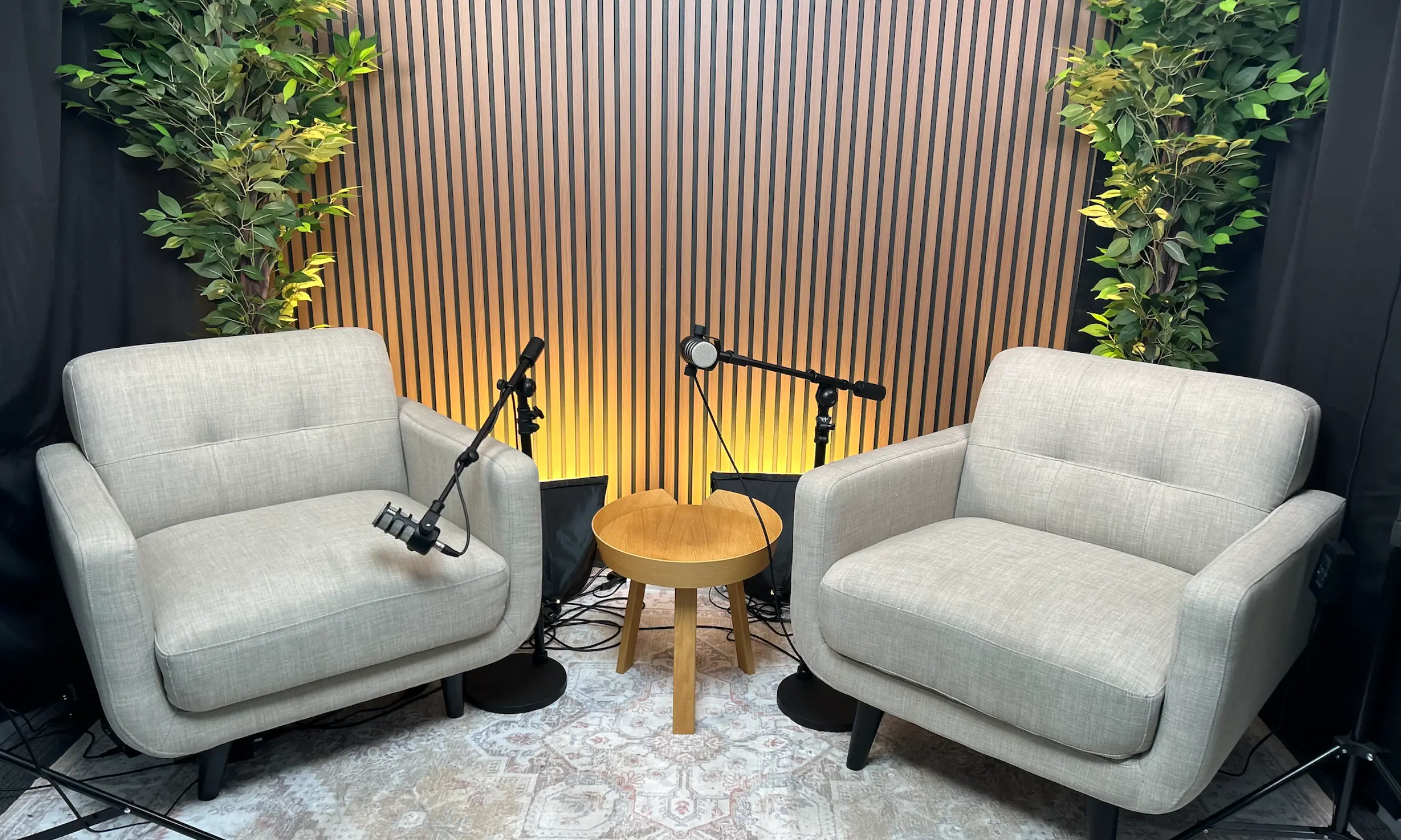 Podcast in comfort - sofa seating, 3 mics, studio lighting